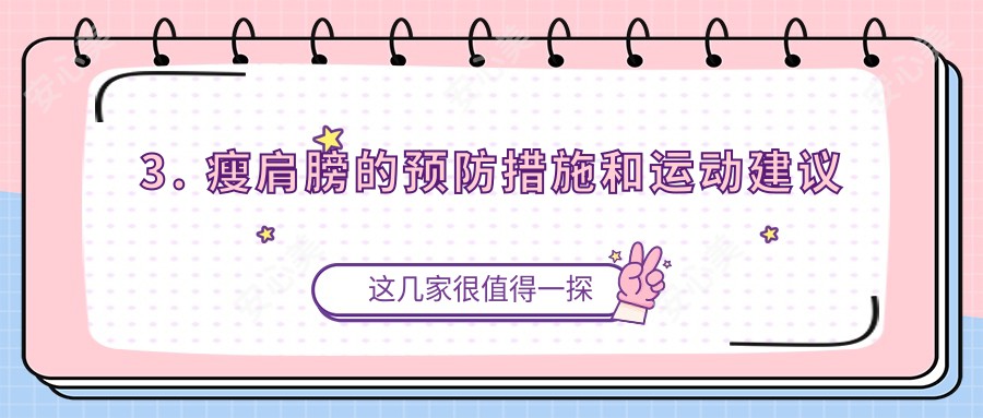 瘦肩膀的预防措施和运动建议主要包括保持正确姿势、避免长时间低头、多做肩部运动。保持正确姿势能够减少肩部肌肉疲劳和受伤的可能性,避免长时间低头能够缓解颈部和肩部压力。同时,多做肩部运动如哑铃侧平举、俯身飞鸟等有助于增强肩部肌肉力量和形成翘臀线条,提高身体的姿势美。所以,通过正确的预防措施和肩部运动,可以有效预防瘦肩膀的问题。